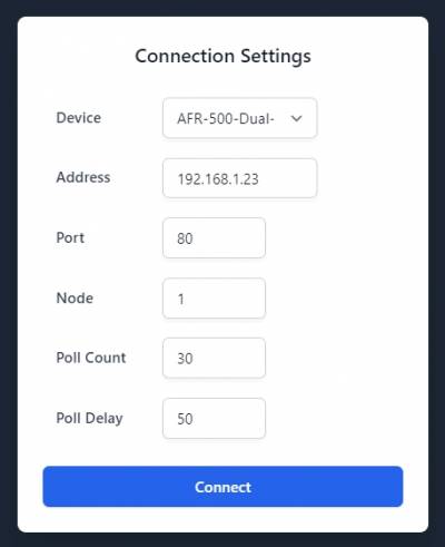 As a direct connection over ethernet, an RJ-45 port is vertically mounted on the AFR-500. Using a standard ethernet cable plug one end into the AFR-500 controller, and the other end goes to a device that can send HTTP requests following the modbus/TCP or Ethernet/IP protocols. In general, the two use cases will be with the Altronic AWI application on a computer or permanently displayed on an HMI.