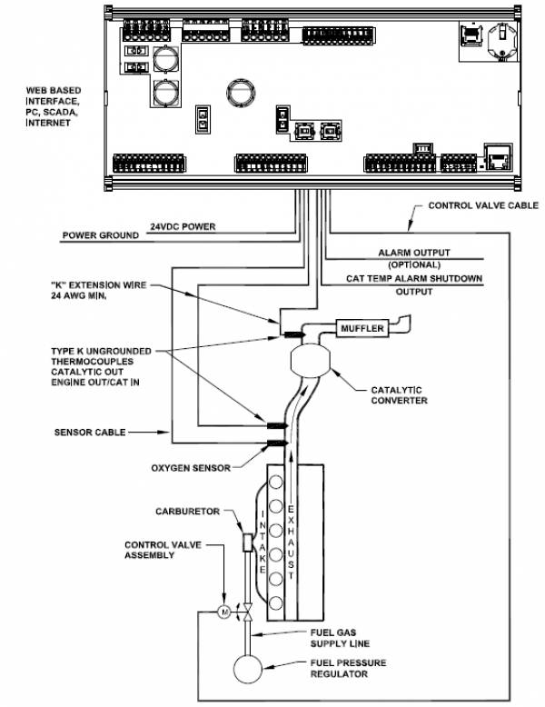 A flexible output control mechanism incorporated into the AFR-500 allows for its use on most all engine applications with a single fuel gas regulator or stepper motor per bank. A heated wideband Lambda sensor “UEGO” is used in the exhaust stream to sense the actual exhaust Lambda value, and a thermocouple input determines when the proper exhaust temperature has been reached to allow for accurate air fuel ratio operation. The system fuel control valve installed in the fuel line to the carburetor is precisely adjusted under microprocessor control to maintain the correct engine air-fuel ratio. The desired air/fuel ratio can be easily adjusted by changing the control target set point by changing the internal Modbus register values from any communication capable device such as a PLC, PC, DE-4000 or touch screen display.