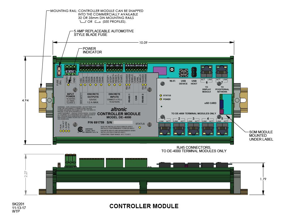 The Controller Module is the hub of the system. It is the main controller interfacing with up to five Terminal Modules, the HMI Display Module, and other systems. The scalable and expandable nature of the DE-4000 allows it to be used on the simplest safety-shutdown-oriented applications, on mid-range applications with minimal or moderate auto-start or capacity control requirements, and on highly-complex units where a significant number of points must be monitored and functions controlled simultaneously. The Controller Module is designed to be rail mounted.