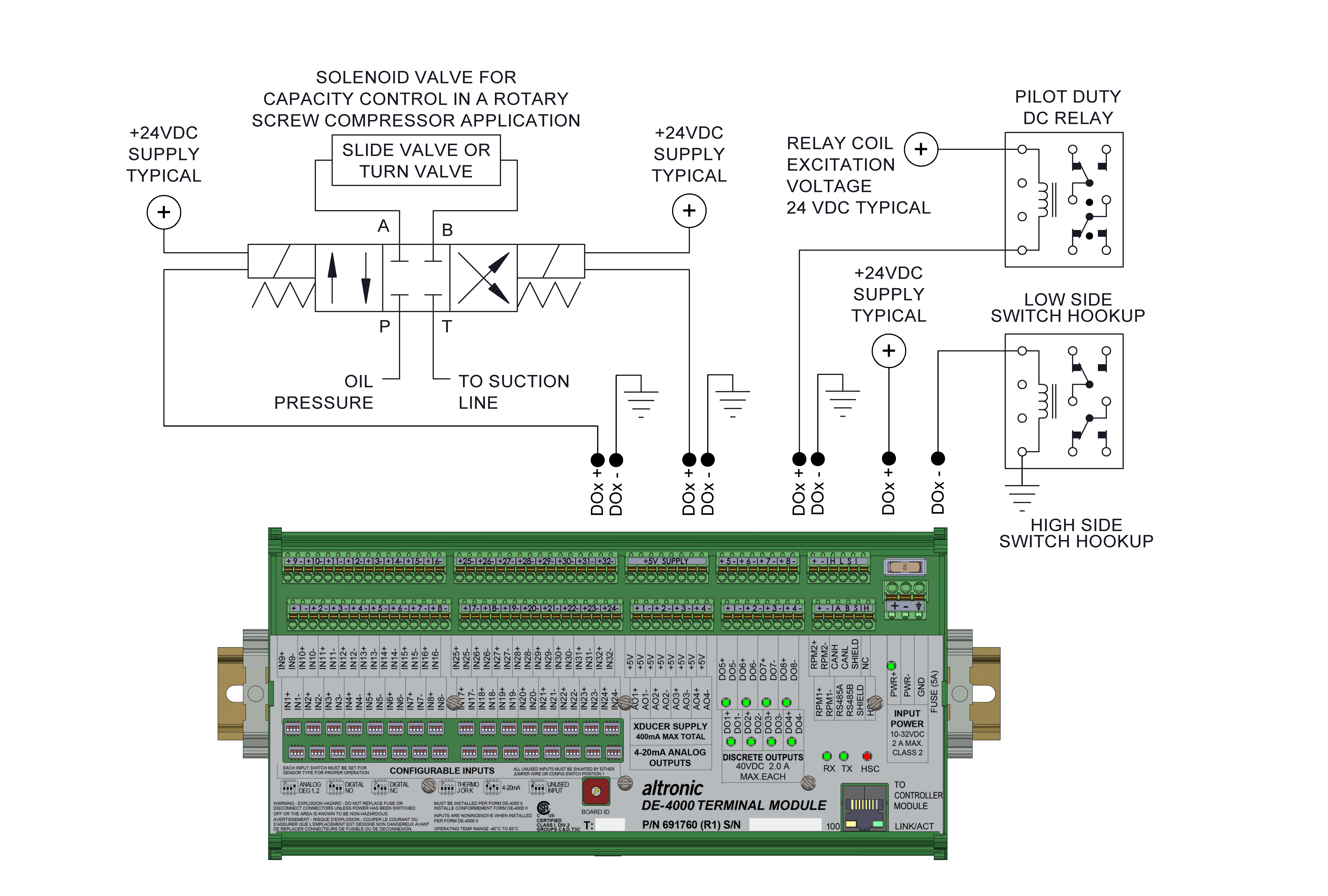 The Controller Module has four discrete outputs rated 52VDC, 1.2 amp max. The discrete outputs provide a means of using the DE-4000 controller to interface with other systems on the engine/motor and compressor. The discrete outputs are typically used for on/off control of on-engine processes. Typical applications are: Fuel Valve, Ignition Shutdown, Purge, and Crank Disconnect. The discrete outputs can be configured for either shelf state (normally-open) or failsafe (normally-closed) operation and have an LED indicator associated with them. If a discrete output is configured for failsafe (energized for run), the LED will be ON in the normal run condition and OFF for a fault condition. For outputs that are configured for shelf state, the LED will be OFF for normal run condition and turn ON for a fault condition. The four discrete outputs are optically isolated, bipolar solid-state switches which are isolated from power supply minus and engine ground. These outputs can be wired as high-side or low-side configurations. The Output Modules are in the open (de-energized) condition when the unit is not powered.