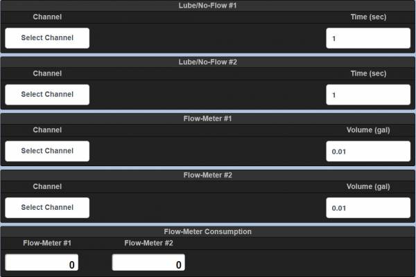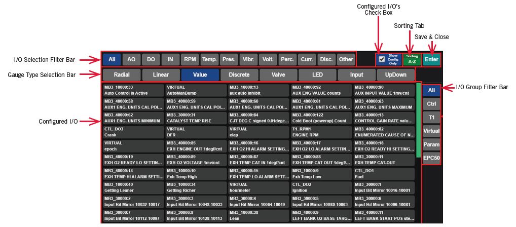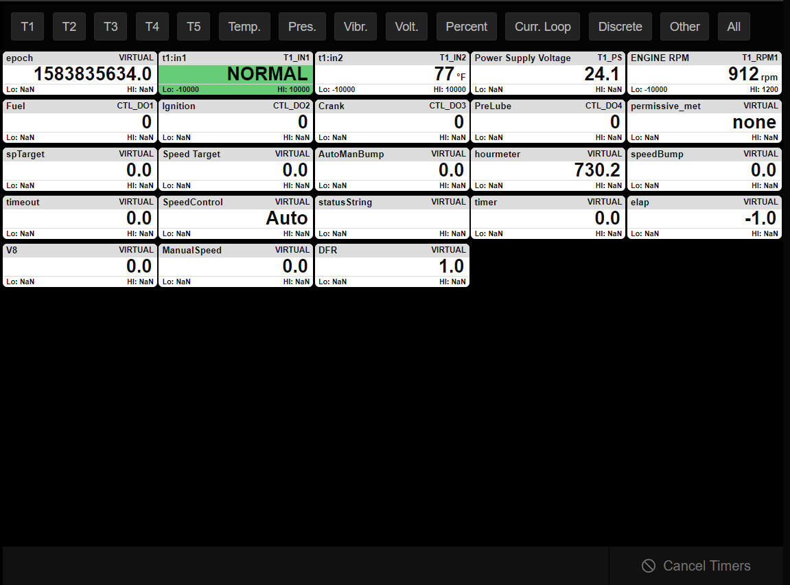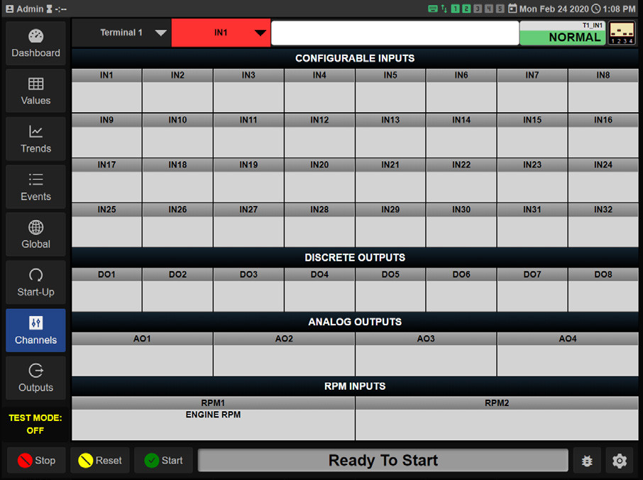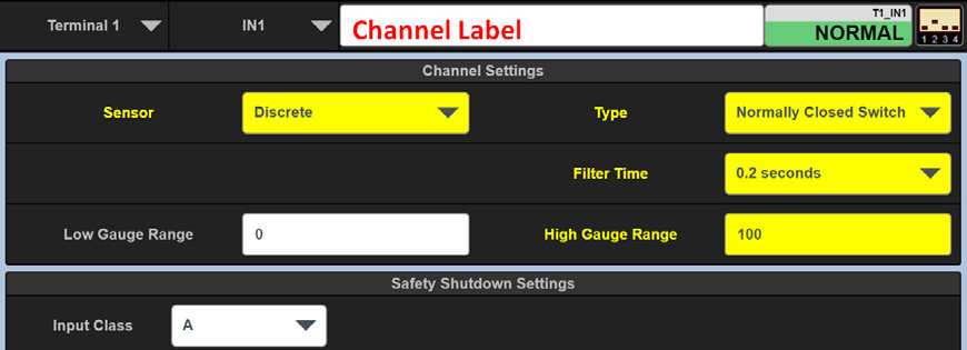 Live data from the Terminal Board Input channels for each of the thirty-two configurable inputs and the two RPM input channels are shown. Each input channel display box will show the Channel Number (Tx_Inx), the channels live Raw Count Value (an internal reference number), live Sensor Data, Units of Measure, Low and High Setpoint values.