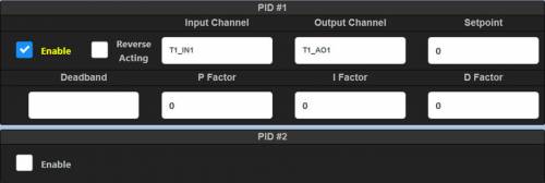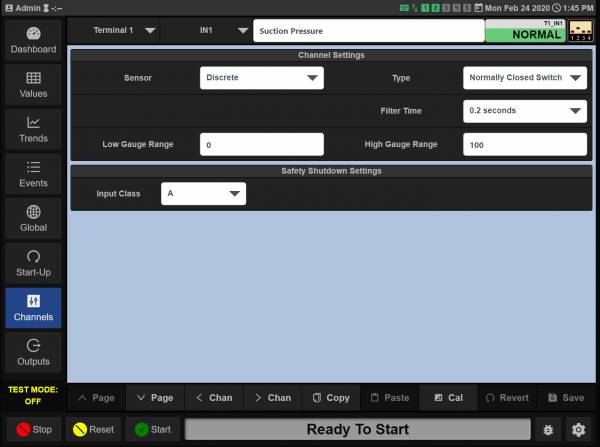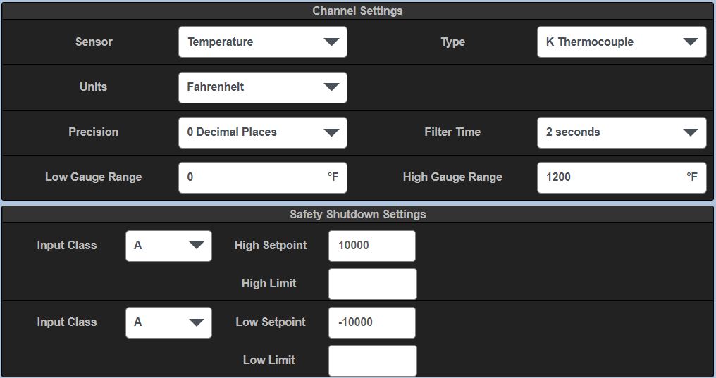 Each channel can have a high and low safety shutdown value, an alarm value, and a control value associated with it. The setpoint values are configured on page one or page two for each channel. In addition, an Input Class must be configured.
