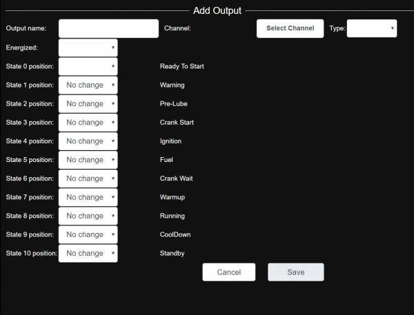 Use the Add Output selection box to configure an Output (valve). Use the Edit Output selection box to configure an Output (valve). Use the Save button to save the configuration, Cancel to ignore the changes, and Delete to remove the Valve configuration. Configure the following items to create an output sequence: