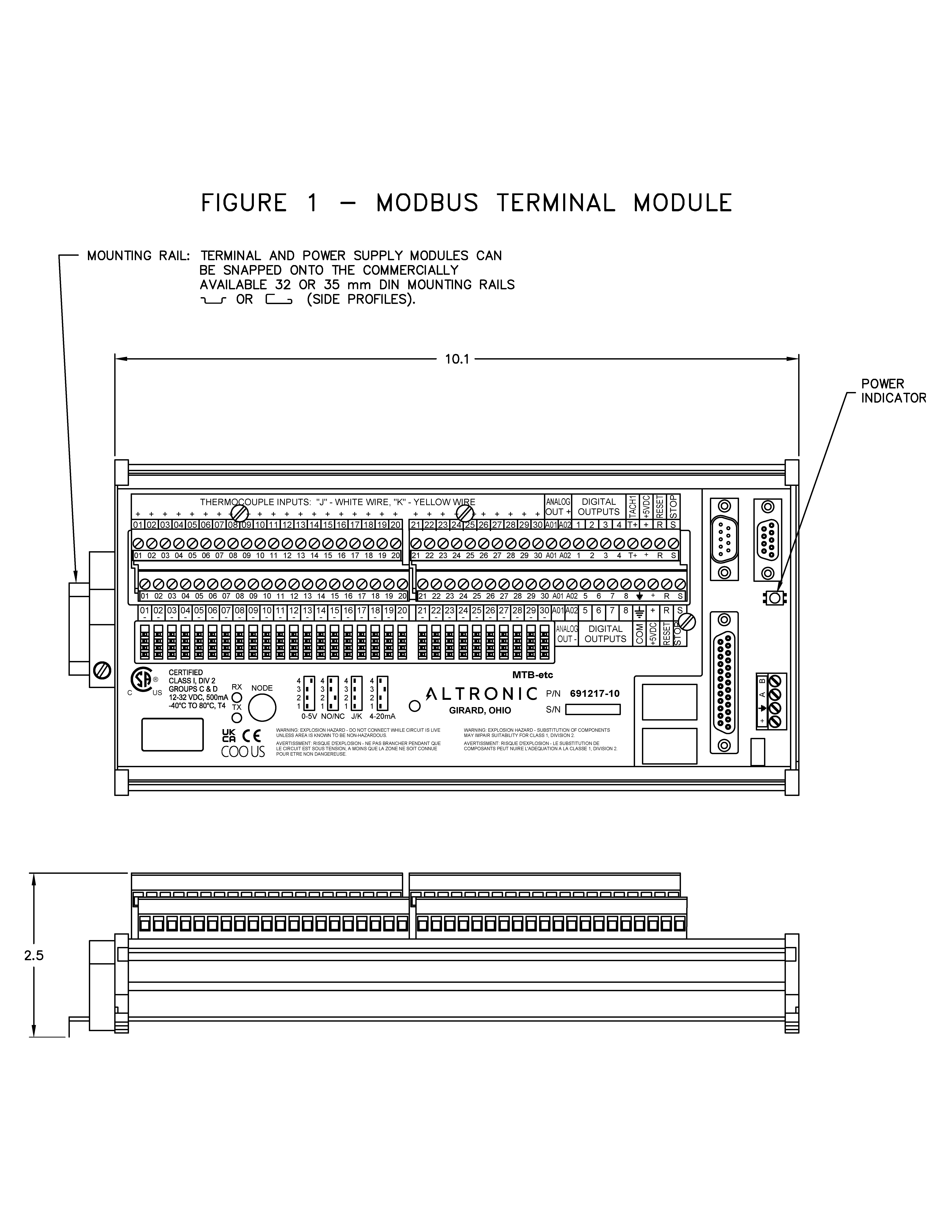 The MTB-etc (enhance temperature control) is a new class of instrument that extends the temperature range for K thermocouples to 1100.0C (2012.0F) and the J thermocouples to 860.0C (1580.0F). All MTB-etc units are factory calibrated to +/- 1.0 degree C accuracy. Floating point displayed values are shown in tenths of a degree. See section 4.3 for more information how to setup the MTB-etc and the thermocouples to ensure the highest degree of accuracy. The MTB-etc is an RS-485, MODBUS RTU slave board capable of reading 33 channels. The first 30 channels can be any combination of digital inputs (N/O or N/C), thermocouples (J or K), pressure inputs, 4-20mA inputs, or read any sensor within the range of 0-5VDC. Channels 31 and 32 can only be used for digital inputs (N/O or N/C). There is also a pickup input. Additionally, there are 8 digital outputs which are capable of sinking 60V at 500mA. Each could drive a relay, horn, or other related device. There are also two 4-20mA outputs. All the outputs are directly controlled by RS-485 Modbus RTU commands. The Modbus Terminal Board is CSA-certified for CLASS I, DIVISION 2, GROUPS C and D areas, when mounted in a suitable enclosure.